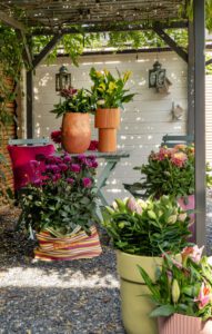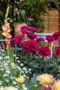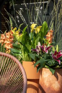 Die Farben dieses Trends sind warm und einladend. Denken Sie an kräftige Farbtöne wie Lila, Flieder und Orange, die mit dunkleren Akzenten durchsetzt sind. Diese Farbkombinationen sind perfekt für Ihren Garten. Kombinieren Sie zum Beispiel Dahlien, Lilien, Callas und Gladiolen für ein Beet, das sofort auffällt. Oder wählen Sie satte, kräftige Farben Ton-in-Ton für einen subtilen, aber ebenso schönen Effekt.