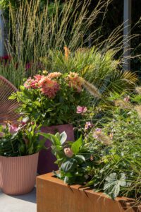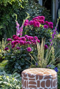 Bei dem Trend ‚ Bold Blooms‘ geht es um Gärten, die Wärme und Gemütlichkeit ausstrahlen. Denken Sie an satte, leuchtende Farben, weiche Texturen und einen Mix aus Materialien, die sich gegenseitig wunderbar ergänzen. Im Garten spiegelt sich dies in runden, weichen Formen, bequemen Möbeln und Beeten voller blühender Pflanzen und Blumen wider.